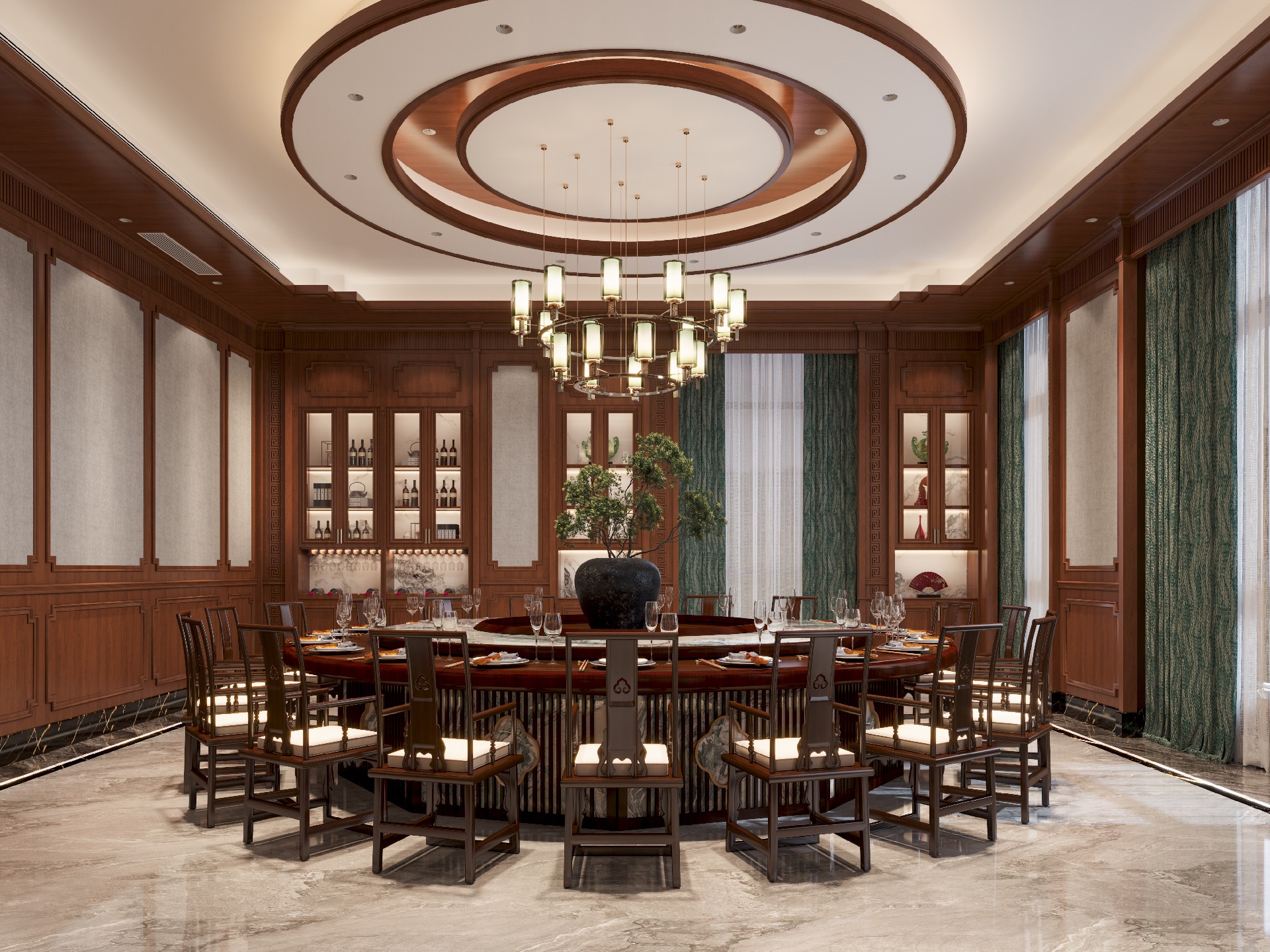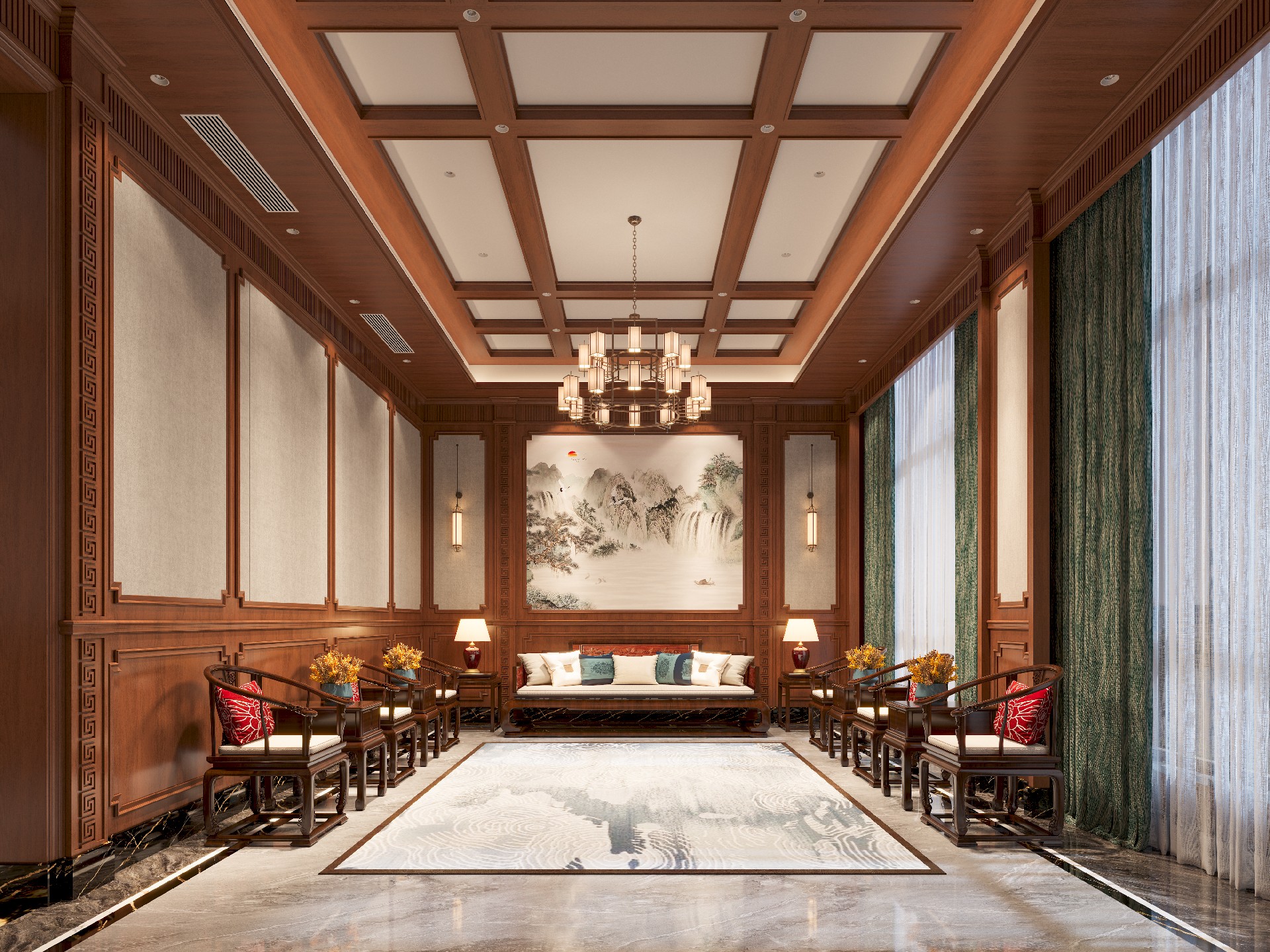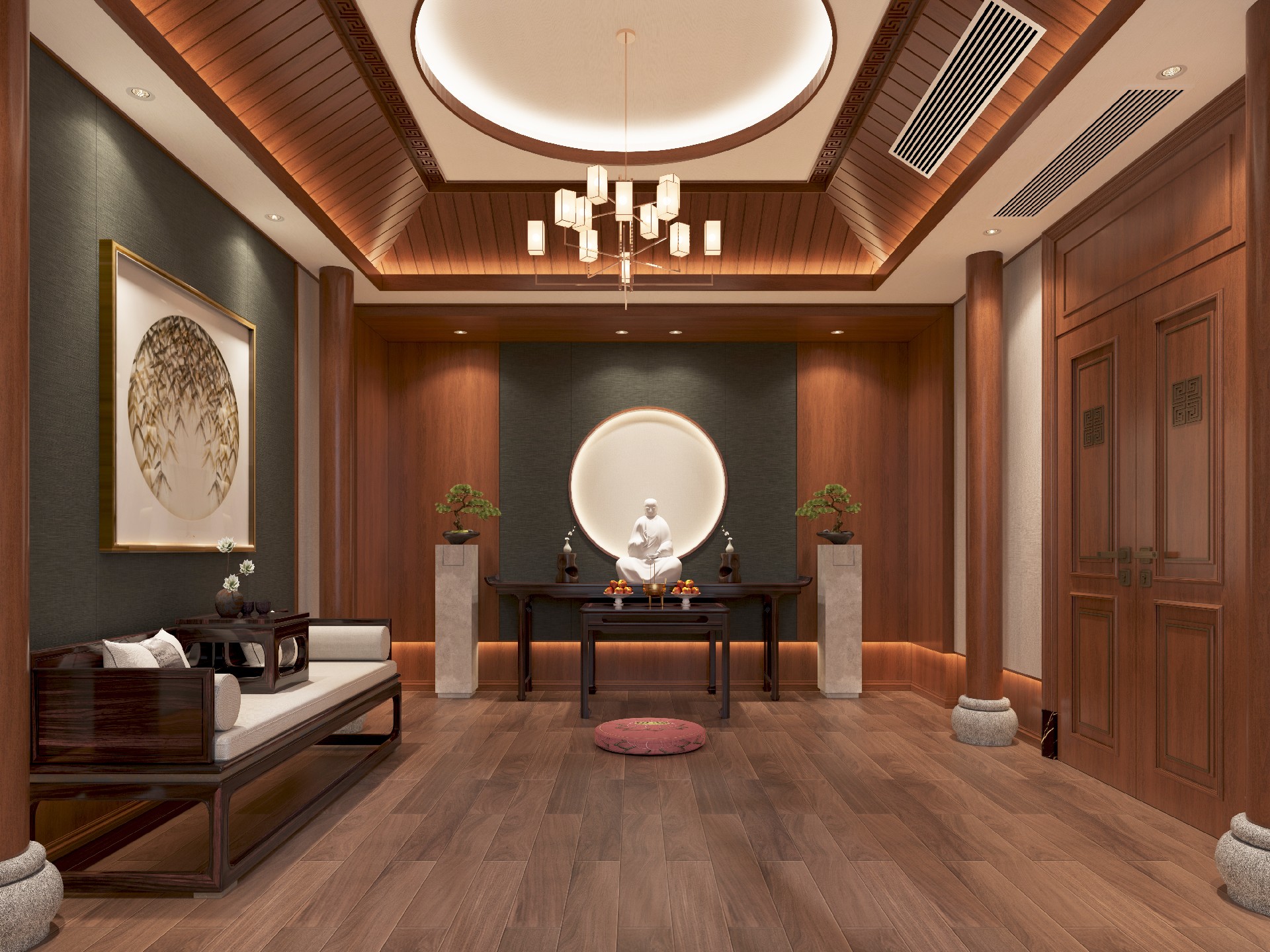 整面墻的TSCN(托斯卡納)美裝家黃花梨木墻板與絲織駝墻板從墻面直抵穹頂,木材自然的棕紅色澤在頂燈映照下,
